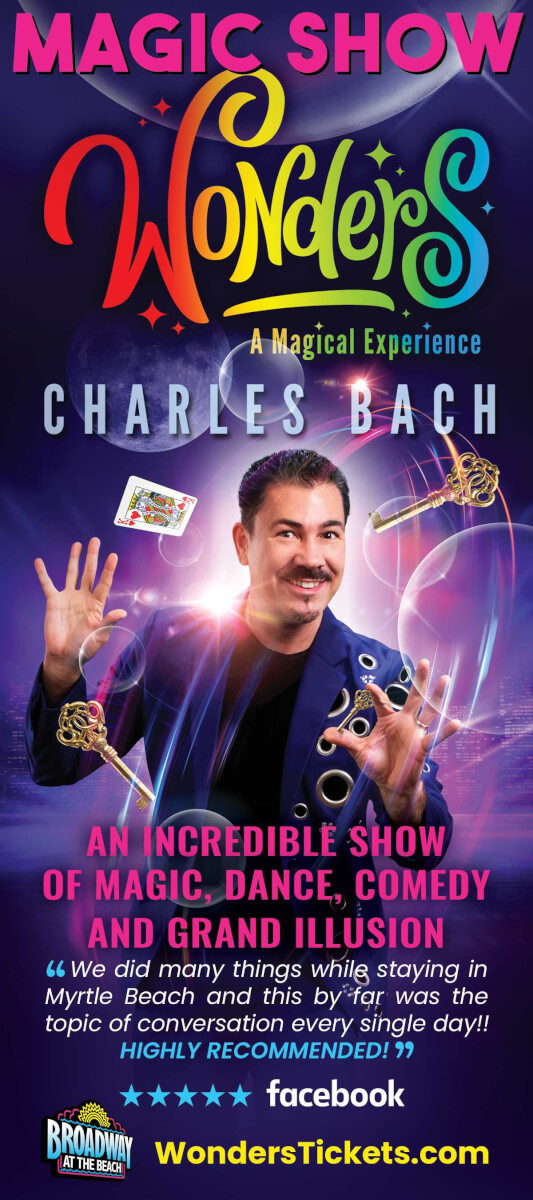 It’s the Biggest and Best magic show in Myrtle Beach! Experience a world-class show of magic, dance, comedy & grand illusion in the heart of Broadway at the Beach. Witness some of the world’s most impressive Las Vegas style grand illusions LIVE. Charles Bach Wonders Magic Show is a family-friendly show for all ages.