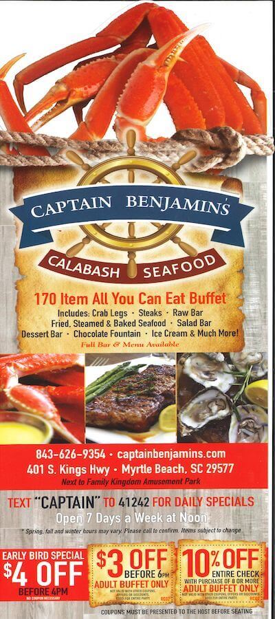 One of the most popular seafood buffets in Myrtle Beach, South Carolina. Captain Benjamin’s has been providing the Grand Strand with genuine Calabash-style seafood since the 1980s.