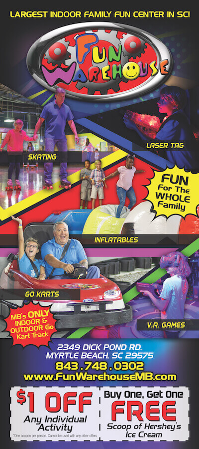 Fun Warehouse is an all-inclusive family fun center in Myrtle Beach, SC. Attractions include a state-of-the-art Arcade with Virtual Reality, Go Karts, Laser Tag, Soft Play & Inflatables, Roller Skating, Mini-Bowling, Café & Ice Cream Parlor!