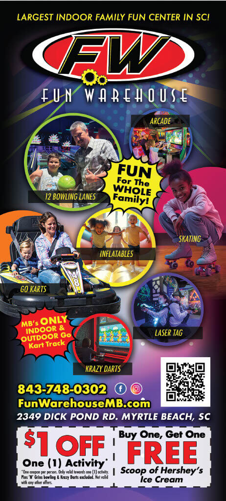 A visit to Myrtle Beach wouldn’t be complete without spending a day at Fun Warehouse, the ultimate family entertainment center. First, strap on your skates and glide across the expansive roller-skating rink. The upbeat tunes keep the atmosphere lively and energetic.