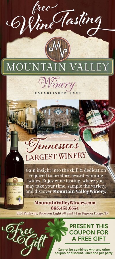 Mountain Valley Winery – You and your family will love learning about the art of winemaking while touring our cellar! Free wine tastings are offered every day. Stop by the next time you visit Pigeon Forge.