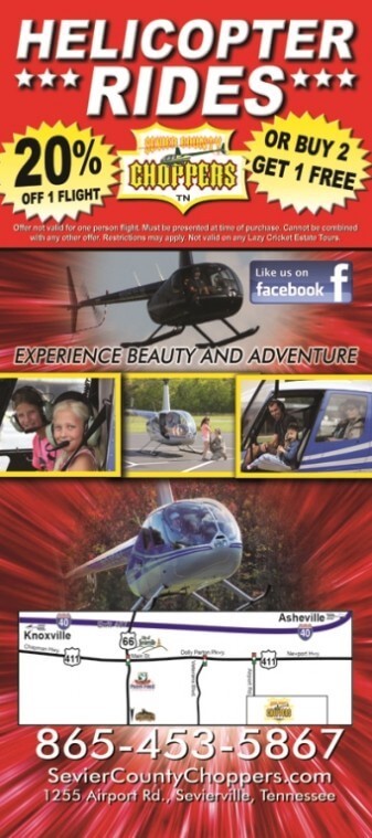 This flight is a good introduction to the helicopter experience. You’ll climb to 800 feet and will enjoy a bird’s eye view of the Smoky Mountains while flying over the city of Sevierville.