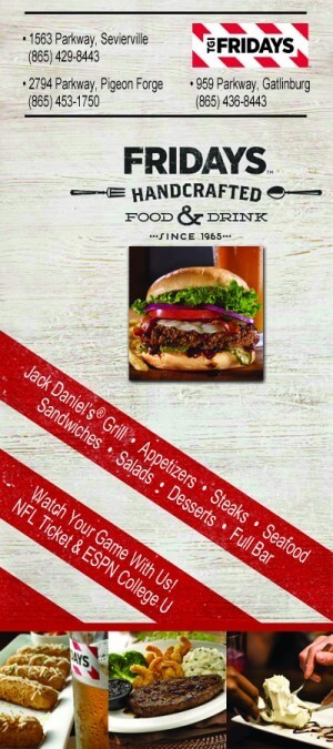 Check out our happy hour and other daily specials. Both our Smoky Mountain TGI Fridays’ locations are conveniently located on the main Parkway.