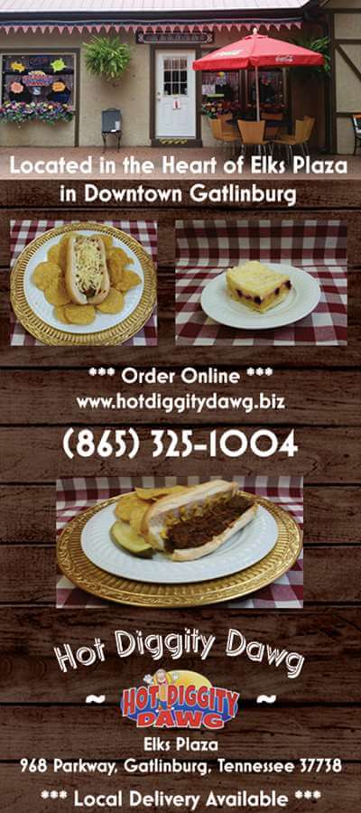 Welcome to Hot Diggity Dawg! Come see us in the heart of Elk’s Plaza in downtown Gatlinburg. Try our delicious, premium hot dogs, home-style BBQ pork sandwiches, genuine polish sausages, and much more! Choose from an assortment of toppings, cold drinks, lemonade and snow cones!