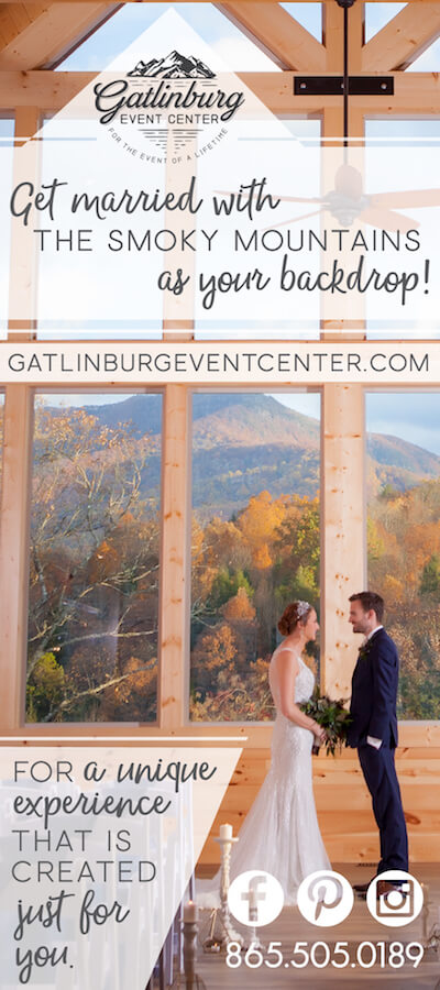 Nestled atop a scenic mountain ridge, the Gatlinburg Event Center delivers breathtaking views of both Mt. Le Conte and Greenbrier Mountain. Our magnificent, brand new, 6,000 square foot venue and outdoor deck can accommodate up to 250+ guests.