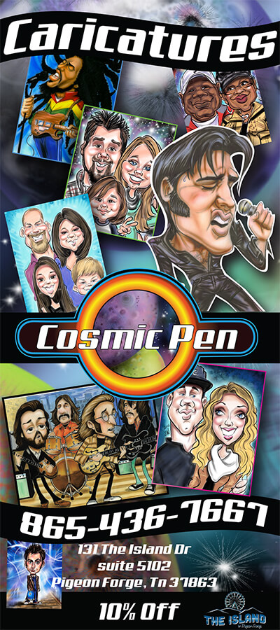 Welcome to The Cosmic Pen Caricature Studio. We are an artist owned and operated business located at The Island in Pigeon Forge, Tennessee. Our skilled artists create live digital caricatures while you wait or we can draw from pictures for your friends and family. We carry live hand drawn digital caricatures, artist retail, prints, key chains, magnets and frames for all your caricatures.
