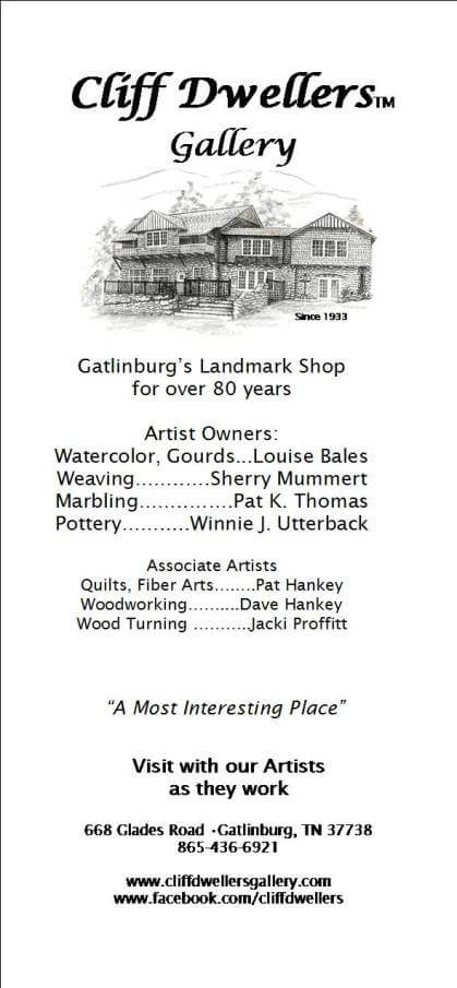 The landmark fine arts and crafts shop in Gatlinburg since 1933, Cliff Dwellers Gallery was built by artist Louis Jones as his studio, gallery and home. The building was moved from the Parkway in downtown to the heart of the Great Smoky Arts and Crafts Community in May 1996. It continues to house both gallery and workshop space as it did for the original owner/builder, Mr. Jones.