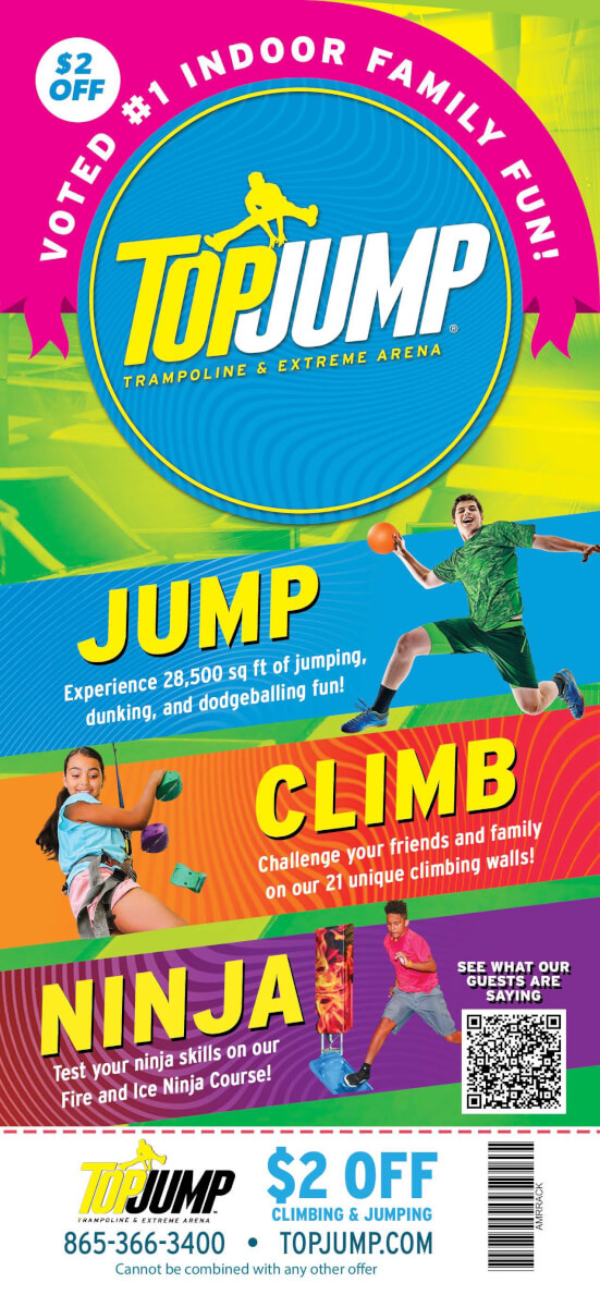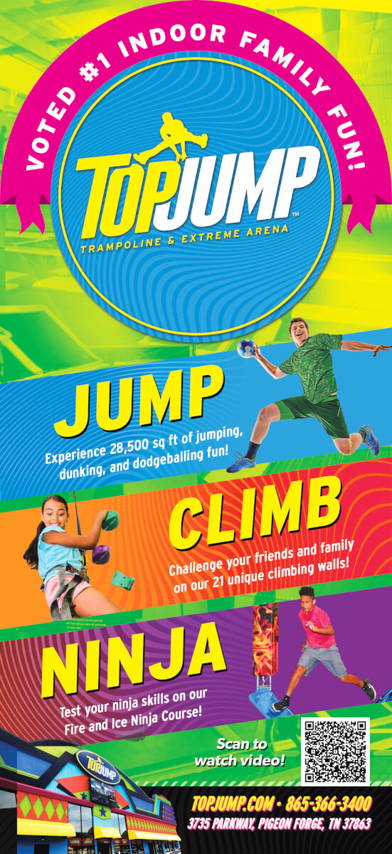 Jump, dunk and dodge with Erika, our Smoky Mountain Explorer, at TopJump Trampoline Park. There’s plenty to do at TopJump with their trampoline park, climp ‘n climb, arcade and candy store, Sugar Rush. Large groups and parties are welcome!