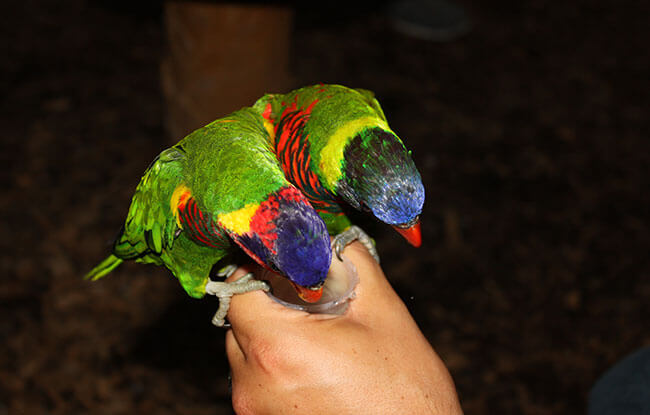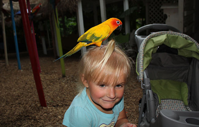 When we visited, our daughter was given some food to feed the crow they had in one of the caged sections of the park. In general, however, most of the birds I saw were able to roam freely, especially in the section they call the “Secret Garden.” A highlight was being able to do the photo shoot with as many birds as we could fit on us (for a fee), but there are areas where staff members will let you hold a parrot or let one sit on your shoulder for free. Our daughter got an experience of her own, with her head being a perch!