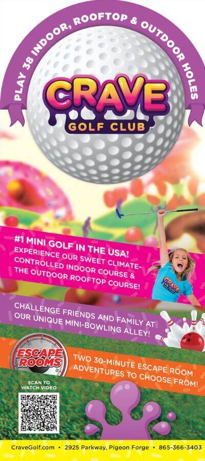 For a mini-golfing experience as sweet as the day after Halloween, check out Crave Golf Club on the Parkway in Pigeon Forge. The 19-hole rooftop course treks across mountains of rock candy, jungles of jellybeans, and a garden made of bubblegum. Meanwhile, the indoor course is a wonderland of chocolate cliffs, ice cream canyons and a candy safari that will have you drooling as you play through 19 holes. Don’t let the friendly sugar-cone characters fool you, though! Playing the optional Spin Zone tasks makes the game that much more difficult. Crave Golf Club also hosts two unique escape room games and a mini-bowling alley. Before you leave, make sure to visit the sweet shop to treat yourself and the kids to your favorite classic candies!